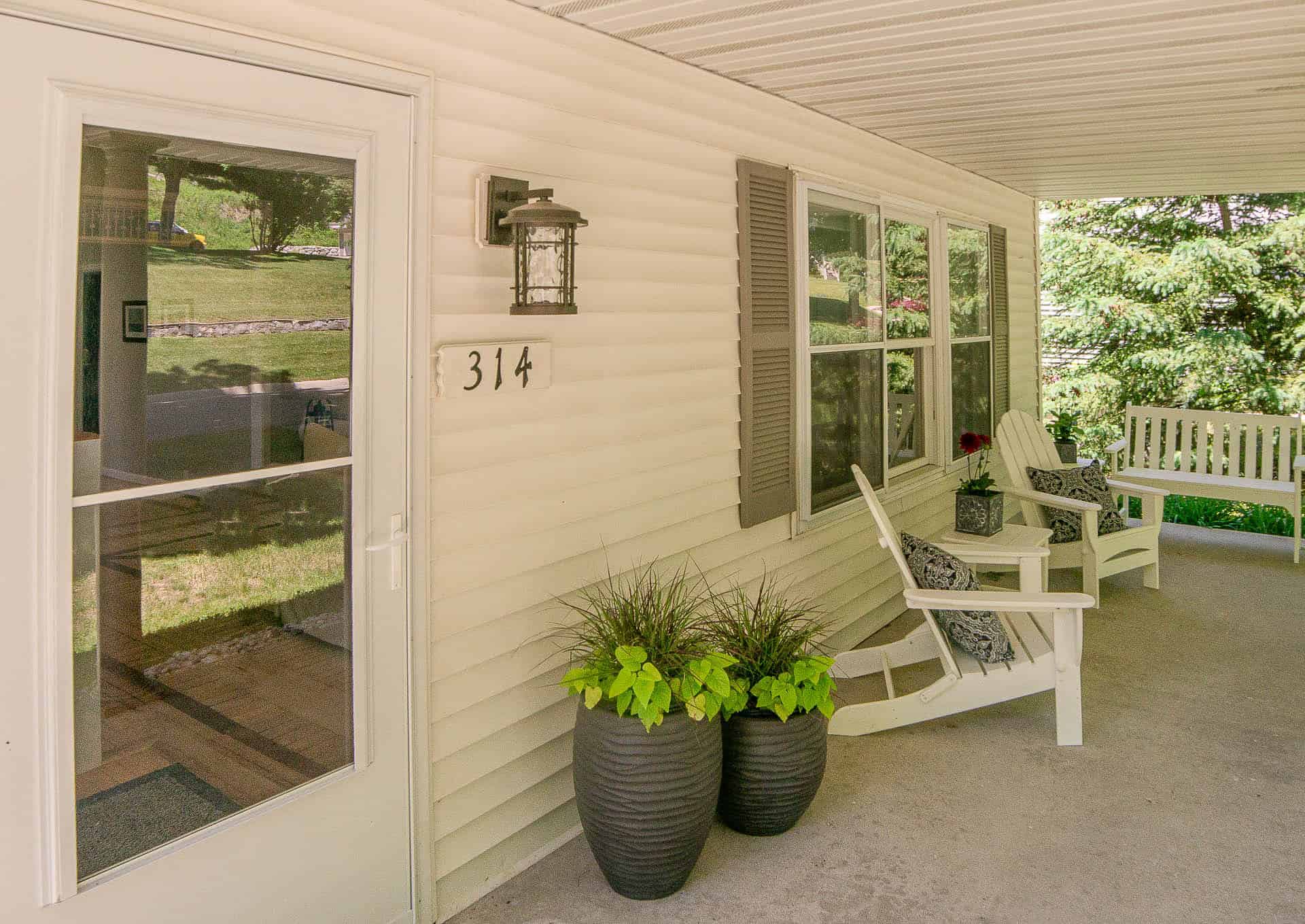 Covered Front Porch: Shaded and welcoming, the front porch invites you to enjoy your morning coffee or simply relax. The Adirondack chairs, bench, and tables provide the perfect setting to gather to share in conversation.
