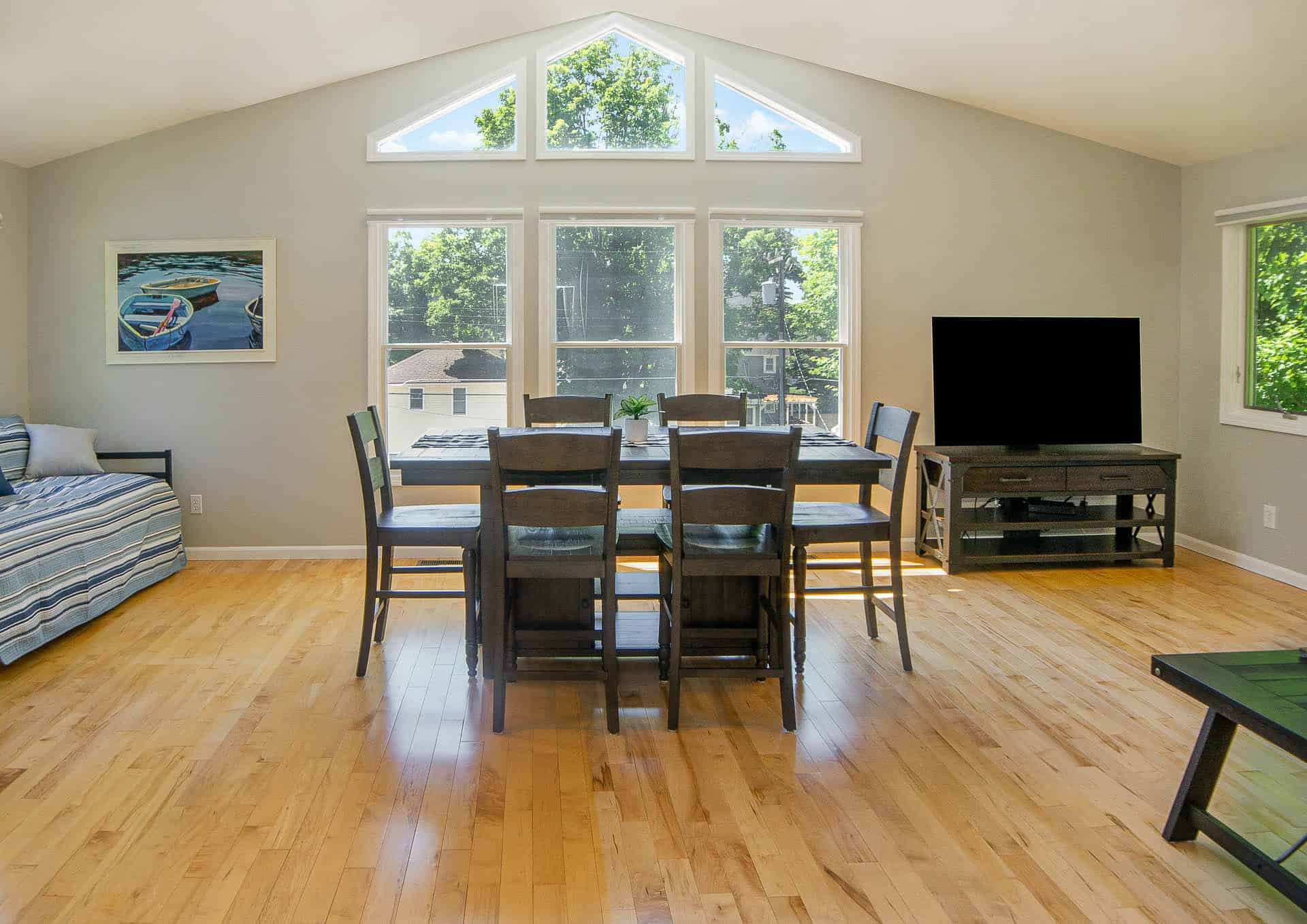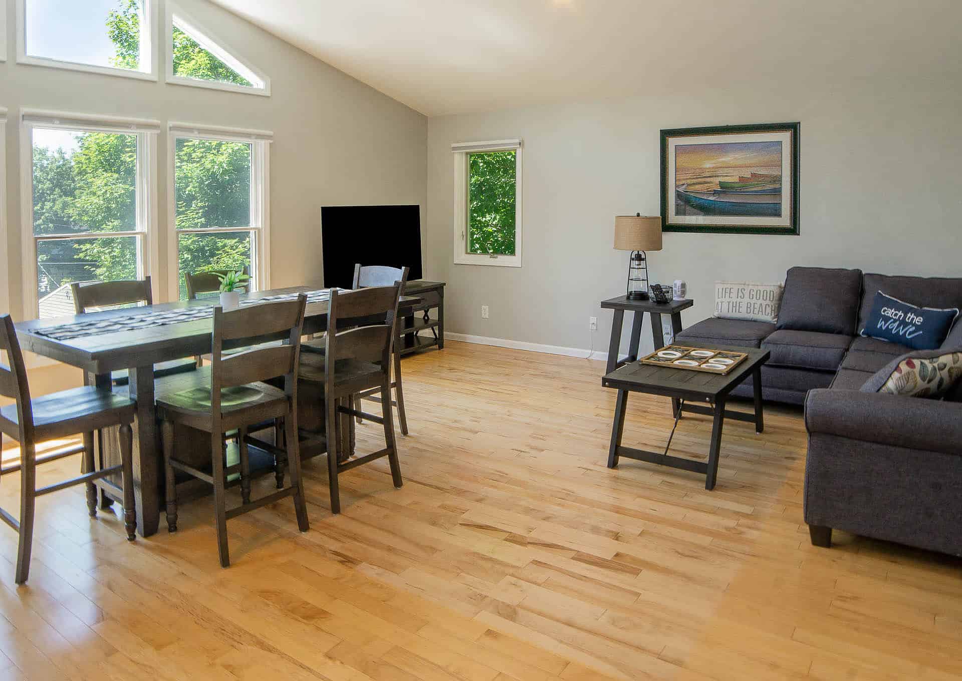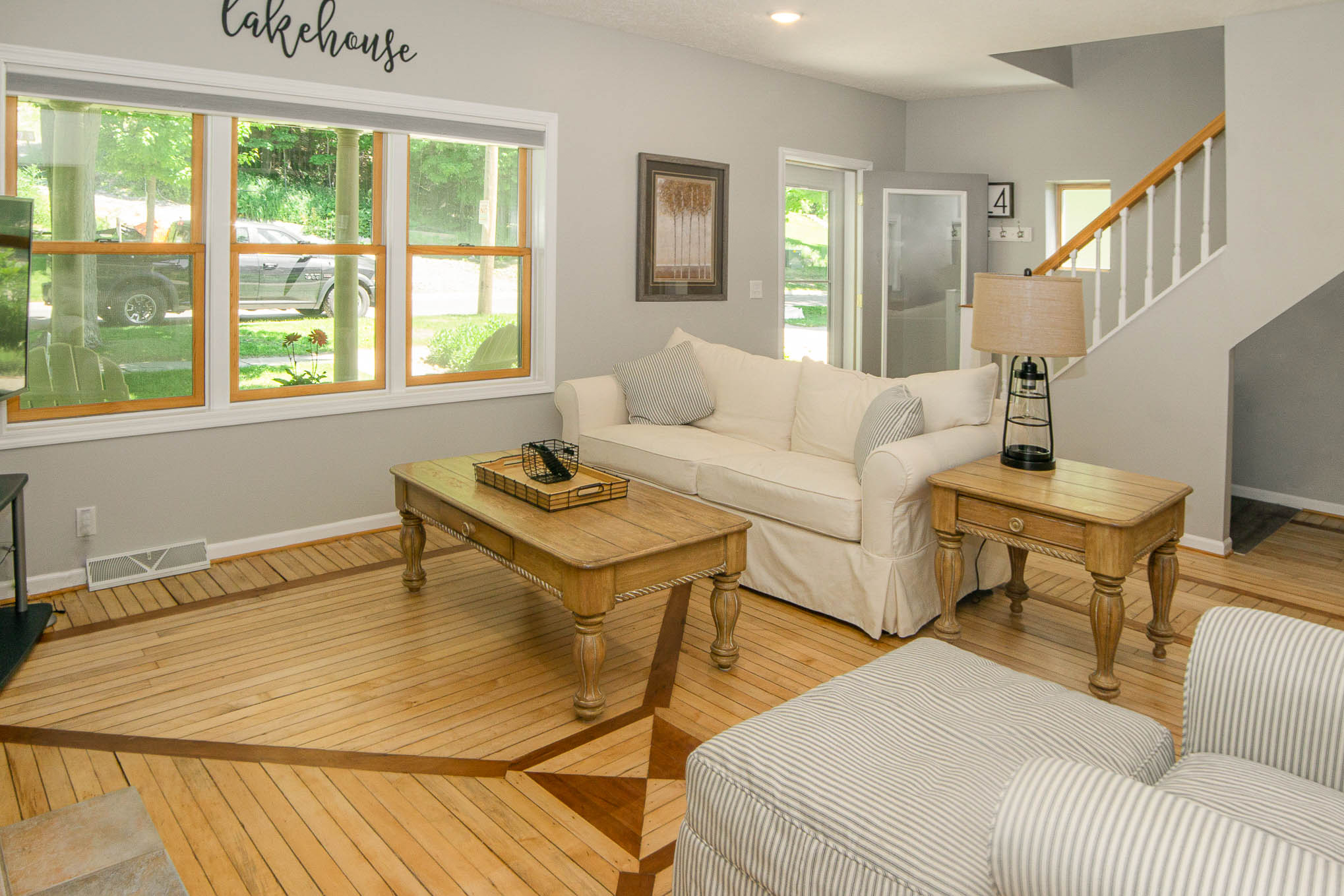 Living Room: The beautiful maple and cherry hardwood floors showcase an original and relaxing design. With windows facing the front porch, the comfortable furnishings make it a cozy room to gather and share stories. The large screen Smart TV is perfect for movie nights or catching up on your favorite shows.