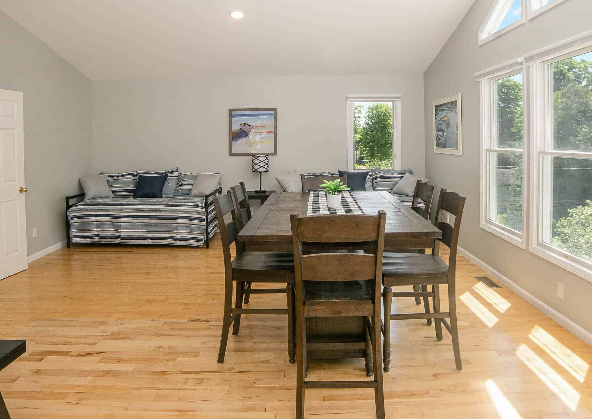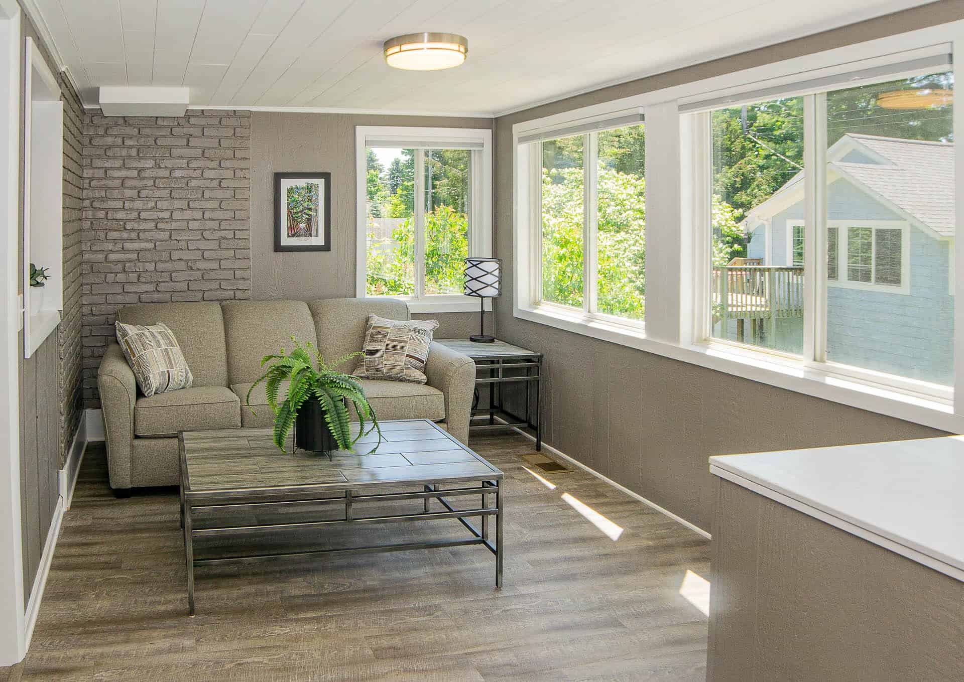 Sunroom (Queen Bed): Sunlight floods through the expansive windows, making this one of the brightest spots in the house. Unwind, you have found a perfect retreat for morning coffee, quiet moments, or leisurely reading. The Sunroom features a sleeper sofa with an optional sleeping accommodation inviting you to enjoy the cool summer breezes.