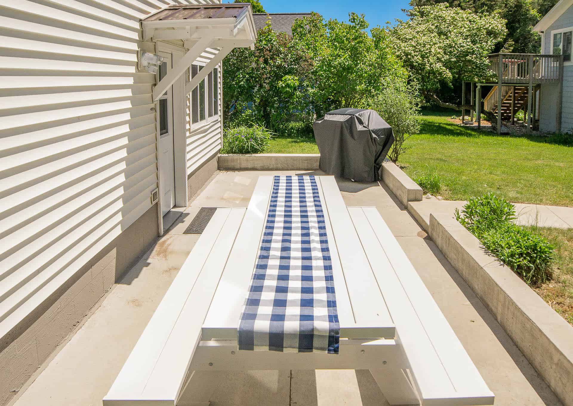 Rear Patio: Bask in the sun on the rear patio or use the Shade Umbrella to stay cool and enjoy the fresh air. Bar height tables and stools provide a casual gathering spot for Happy Hour or dining al fresco. An additional picnic table ensures ample seating for outdoor meals and gatherings. Fire up the Gas Grill and you will be ready for your backyard barbeque.